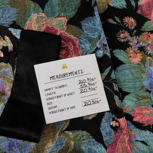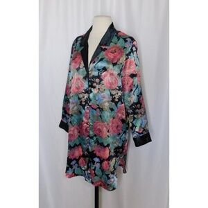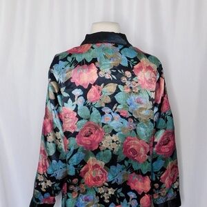 Notched collar at neckline ~ Long sleeves with contrasting cuffs ~ Fabric covered button closures all the way down the front ~ Slightly curved hemline with slits on the bottom/sides ~ Silky satin-like unlined fabric … fabric does not have any stretch ~ Baroque inspired floral print in shades of black, pink, purple, blue & green … the collar and sleeve cuffs are solid black