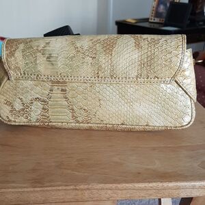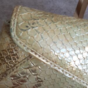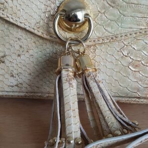 VIATA vintage sparkly gold and yellow clutch bag with snap closure zippered closure,and tassels. It has a wrist band and long attachable strap. The long strap is a bit stiff but otherwise the bag is in great previously owned condition.