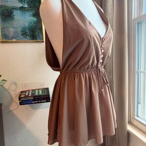 Vintage babydoll style flowy top with elastic cinch waist, tie details, functional buttons, v neck, open arms and back