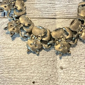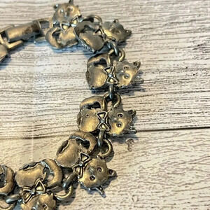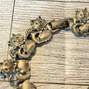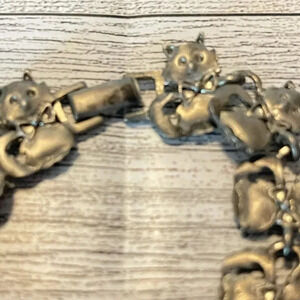 Super cute vintage silver what appears to be pewter cat bracelet with a fold over clasp. There are 11 cats with adorable bows making up this bracelet and they go all the way around. Slightly tarnished, but still a super cute vintage piece.