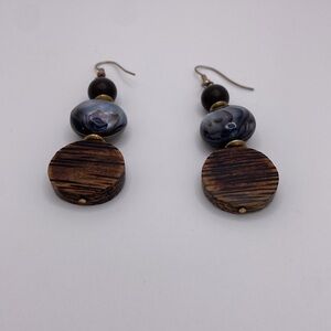 Vintage VTG Three Bead Dangle Earrings Wood Silver Tone