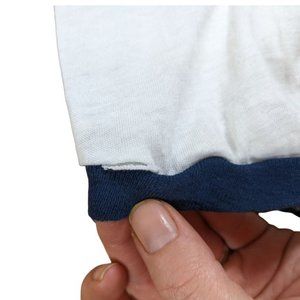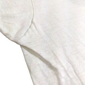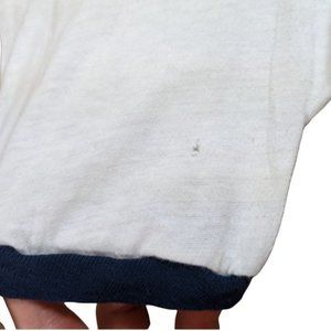 Flaws: Hole on the sleeve. Stain on the shoulder. Small brown spots on the rear of the shirt. Uneven hem. Thin shirt, worn through. Pilling throughout the shirt, worst in the armpits. Fading on the face. Funky stitching from manufacturing on the sleeve & collar.