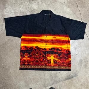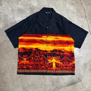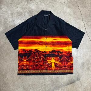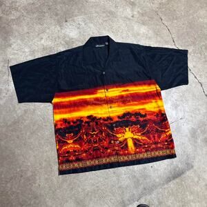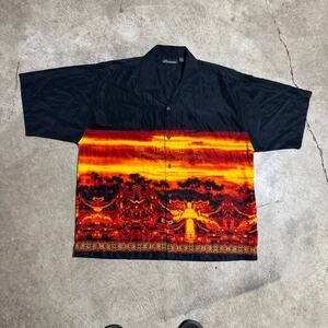 no boundaries, y2k aesthetic, short sleeve, button down, colorful sunset, oversized fit, vintage shirt, casual streetwear, bold graphic, summer top