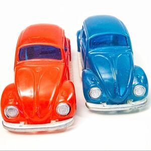 - Two small plastic VW toy cars, red and blue, year/maker unknown, Made in Hongkong. Excellent vintage condition.