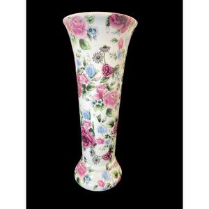 This porcelain vase features a vibrant floral pattern with pink and blue roses. Its elegant design enhances any space, offering a touch of sophistication.