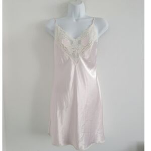 Vintage Val Mode Lace Trim Satin Effect Light Pink Slip Night Dress Chemise