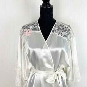 Vintage Val Mode Lingerie Robe White Silky Lace Floral Embroidered Large