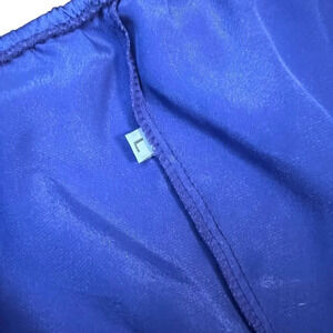 This set is stunning. It’s simple with a few standout details like the rope embroidered shoulder strap holders. The fabric is a purple/indigo color made from 100% polyester. The bottoms are cute little shorty shorts which do need a little elastic work for a secure fit.