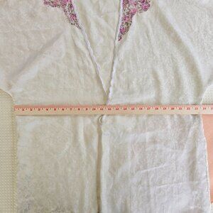 Vintage wrap-style white satin robe with a jacquard floral pattern and pink embroidered lace shoulders. Drapey flutter sleeves, gathered waist, and timeless elegance โ wear as lingerie, a photoshoot piece, or styled as a dreamy dress ๐ธ