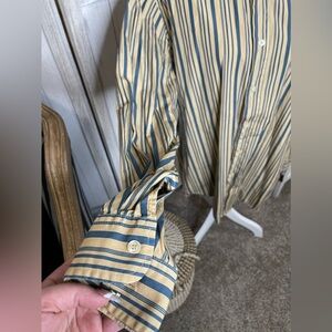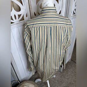 This vintage Valentino Jeans button-down shirt for men is a classic addition to any wardrobe. The shirt features a yellow and blue striped pattern with long sleeves and a collared neckline. The fabric is made of 100% cotton knit, making it comfortable to wear in any season. The shirt has a button-down closure and a button-down collar style.