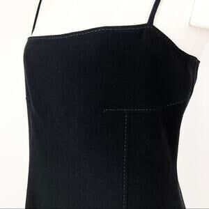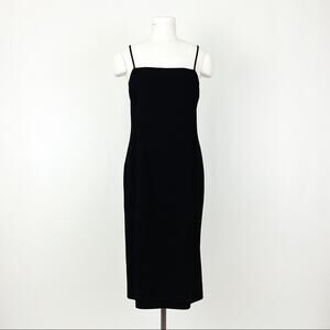 Vintage Valentino midi slip dress in black. Features thin shoulder straps, square neckline, and midi-length sheath silhouette. Decorative stitching at seams, concealed zip with hook & eye closure at back. Fully lined.