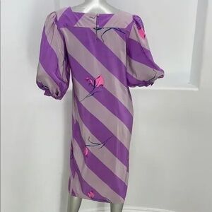 This knee-length sheath dress features a striking diagonal stripe pattern with floral embellishments in shades of purple, violet, and pink creating a unique and eye-catching look.