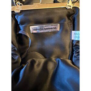 Elegant vintage evening bag by Valerie Stevens, featuring intricate black beading and a silver frame. Comes with a long strap for versatile wear.
