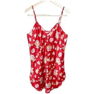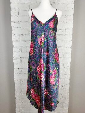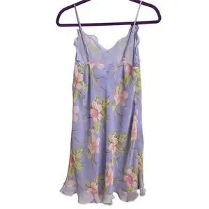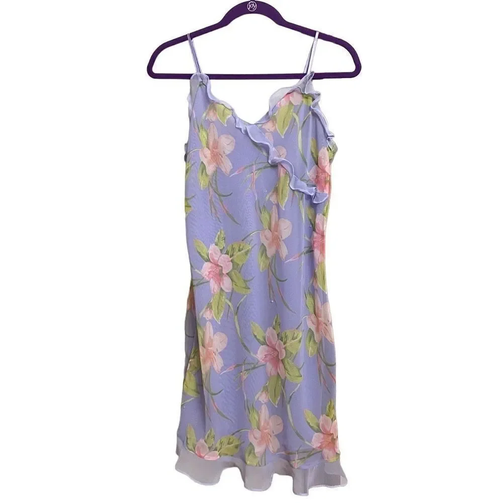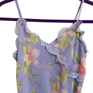 Sweetheart neckline with ruffled bust accents. Small sequin details throughout with pink bold florals. Sheer outer layer with a built in slip for opacity. Midi length and matching chiffon skirting at the bottom hem.