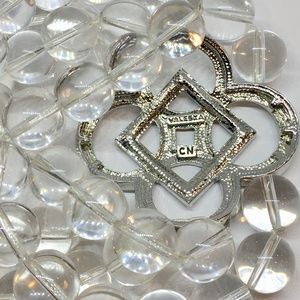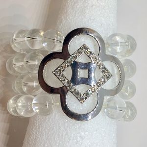 This is a rare vintage Valeska celtic design bracelet. The bracelet features a silver-tone metal Celtic design with crystal embellishments, attached to four rows of clear beads forming a stretch bracelet. Hallmark is Valeska, CN.