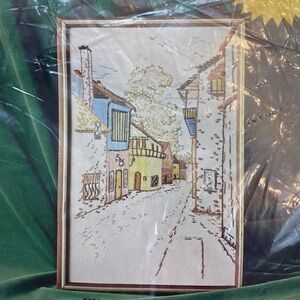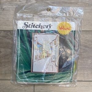 Vintage new in package NIP needle point yarn cross stitch kit by Valiant crafts stitchery line. Number 7601 Street scene features a rustic cobblestone village with brick houses. 12 inches by 18 inches finished product. Great for beginners and sure to give that vintage look finished product.