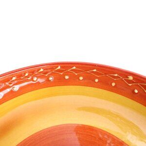 Vintage handcrafted round ceramic Vallauris bowl by Terre de France from the 1950s. Yellow and orange colors with 3D sun design in the middle and geometric design along the edge. 8" in diameter, 1.75" high. No cracks, no crazing. There are small scratches from use. Heavy.