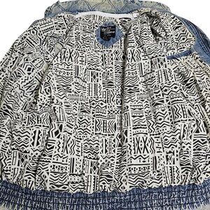 This jacket is pre-owned. It has definitely been worn and abused. There are lots of areas with staining. The bottom is torn/frayed. The sleeves have a nylon lining. One of the sleeves has some holes in the lining near the cuffs. The collar has a zipper and there used to be a hood inside but it has been torn out. Please see all photos to get the best idea of the condition. If you have any questions please message me.
