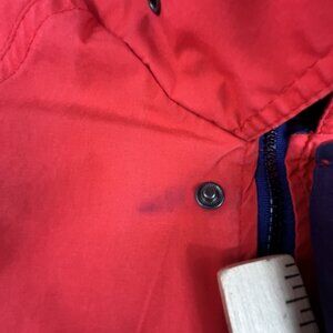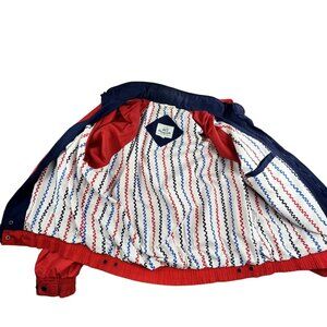 Classic 90s styling with bold red exterior and navy blue accents. Multi-color striped inner lining in red, blue, and black. Ribbed cuffs and hem. Snap button and zip front closure. High collar with zip closure.