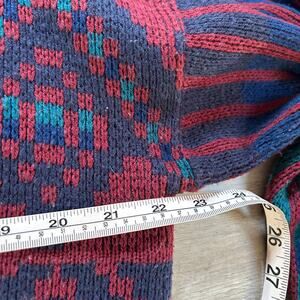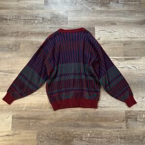 Vintage Editions by Van Heusen sweater featuring bold burgundy, navy, and emerald color blocking in a textured geometric knit. Made in Korea with rich 80s construction and grandpa-core appeal.