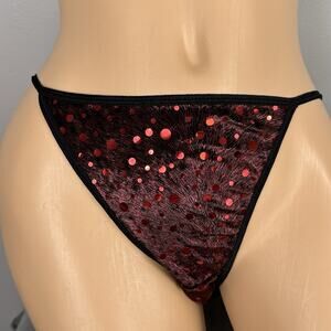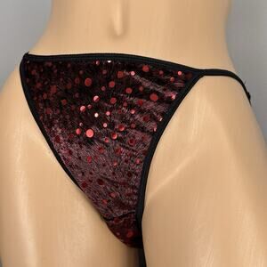 Make a bold statement with these eye-catching Vintage Van Mar string bikini panties in a rich black and red velvet. The front panel features a red/black mini stripe almost textured look front with glittery foil dot accents, while the back is smooth stretch velvet for comfort and allure. Sexy, fun, and unmistakably Y2K in style.