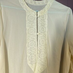 • Lace trim at collar, cuffs, and hem