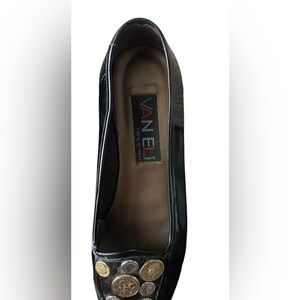 These Vaneli loafers feature a classic silhouette with a striking black and gold color scheme. The standout embellishments on the vamp add a touch of elegance, making them a perfect choice for any stylish occasion. Crafted with attention to detail, they offer both comfort and sophistication.