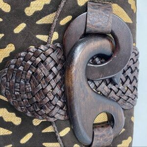 Braided leather strap in center with large wooden knot