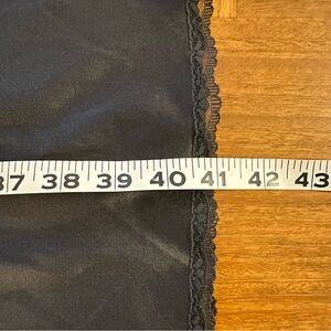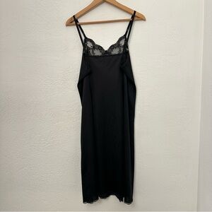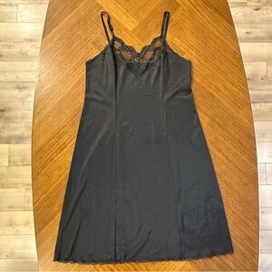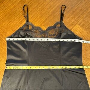 Black vintage slip dress. Adjustable spaghetti straps. Lace trim and details. Good vintage condition. See photos for details. Size 38. Likely best for a modern size medium, possibly large. See photos and below for measurements. Made in USA.