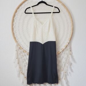 Elegant chemise with lace detailing. Features a cream lace top and black skirt. Perfect for a sophisticated look.