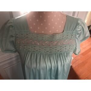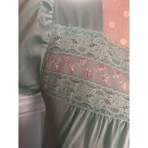 Vintage Vanity Fair Gown Aqua Blue Long Nylon Pink Embroidered Roses Lace Small