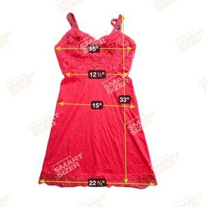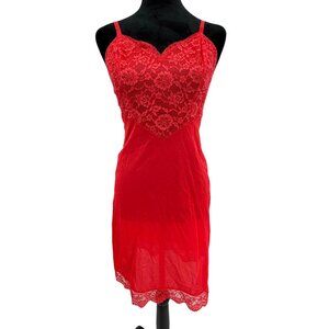 This exquisite vintage slip dress from Vanity Fair features a stunning sweetheart neckline and a flattering empire waist, accentuated by intricate lace detailing. The vibrant red hue adds a touch of bold elegance, while the soft nylon fabric ensures comfort and fluidity in movement. Embrace timeless style and grace with this classic piece, crafted with meticulous attention to detail.