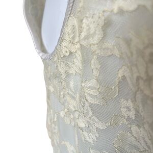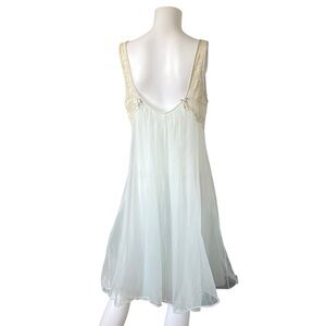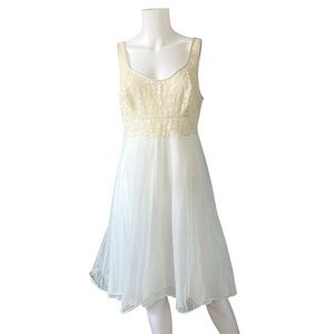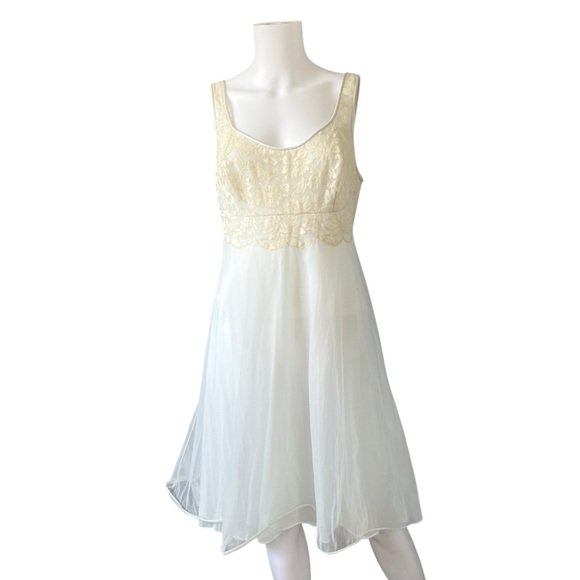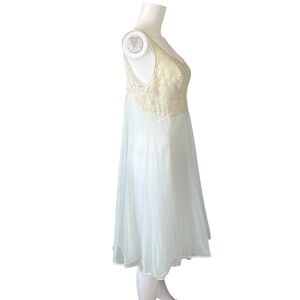 Lovely vintage nightgown with a lace top and double layer skirt. Top is a cream and skirt is light blue. Made in USA. Size 36; see measurements for best fit.