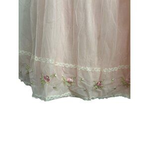 A delicate vintage Vanity Fair slip dress, crafted from pink nylon tricot. Features floral embroidery and lace trim, offering a timeless and elegant aesthetic.