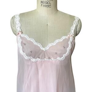 Slip is double-layer chiffon pullover with narrow lace straps, bow accents and embroidered flowers