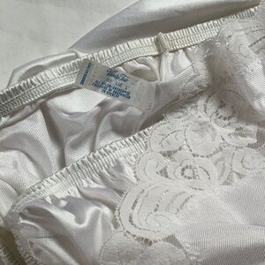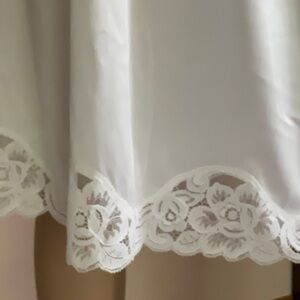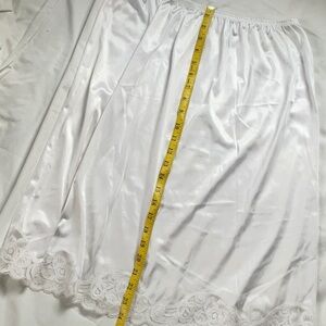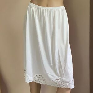Vintage Vanity Fair half slip. White satin with scalloped lace at hem. Midi length. In excellent condition. Elastic is still decent.No signs of wear at all. Made in the USA 🇺🇸. Don’t you miss the quality? From a clean smoke free home.