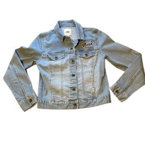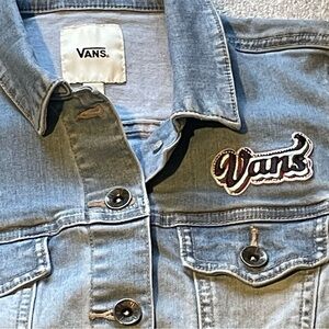 Vintage style vans blue jean denim jacket with vans logo patch on front.