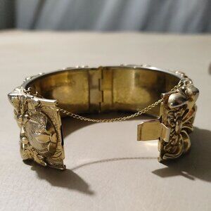 This exquisite vintage Vargus bangle showcases intricate gold-tone artistry and a secure hinged design with a safety chain. Its ornate detailing adds an elegant touch, perfect for those who appreciate timeless jewelry. The bracelet's unique craftsmanship captures the charm of a bygone era, making it an exceptional piece for collectors and vintage enthusiasts alike.