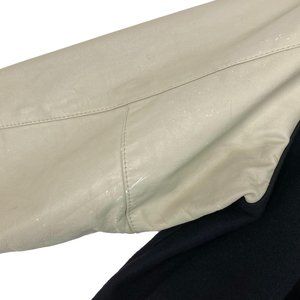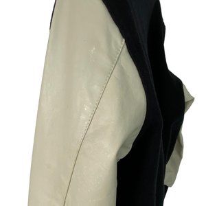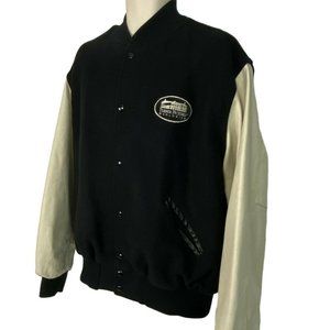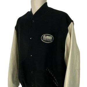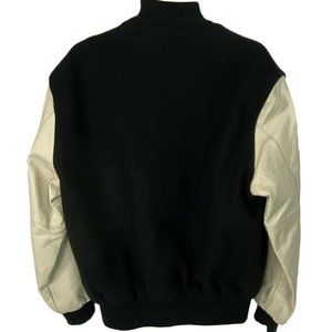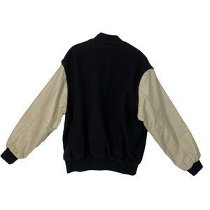 Turner Pictures Worldwide Varsity Jacket * Size XL * Black Wool   * Cream Color Leather Sleeves  * Snap Front * 2 Front Pockets * Made in USA Measurements: * Chest - 54" * Shoulder to Shoulder - 20.5" * Length (Shoulder to Hem)- 28" * Sleeves - 26" Gently Worn Condition - There is some white paint on the sleeves. Please enlarge pictures for a closer look.   The last 3 photos are closeups of the paint.