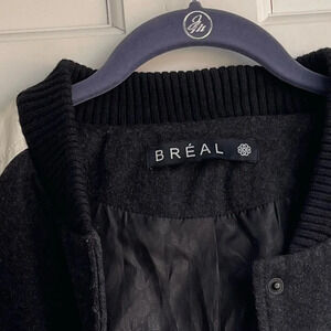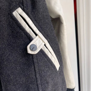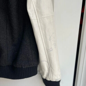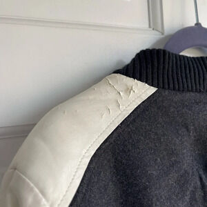 Vintage Varsity bomber jacket wool black and white faux leather sleeves by Patrice Bréal. There is some wear on the shoulder on the white faux leather part, and some blue stain on the back of the sleeve as shown in photos.