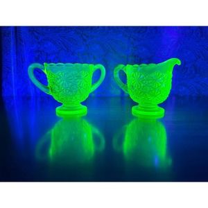 This amazing set of Vaseline glass consists of a open sugar bowl, measuring 5 inches from handle to handle and 3 inches tall, and a creamer, measuring 4 inches from spout to handle, and 3 inches tall in the pattern, daisies and buttons by Degenhart glass co. This rare little set of glowing goodness are stunning in daylight the secret glow kind of sneaks through but added black light makes the breathtaking glow effect. The perfect start or finish for any collectors collection.