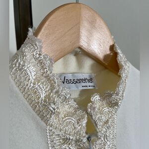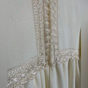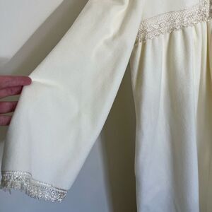 Vintage Vassarette nightgown made in the USA, featuring a soft cream fabric with delicate lace trim details along the mock neckline, chest, and cuffs. Romantic prairie-inspired design with long sleeves, puff shoulders, and a flowing full-length silhouette. Has a partial front zipper closure. Estimated to fit size Small to Medium (pit to pit approx. 19.5”).