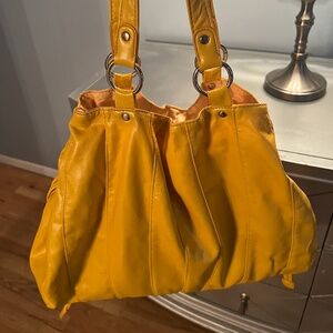 A soft supple floppy mustard yellow leatherette tote with drawstrings looped thru silver grommets - casual - practical with lots of style!