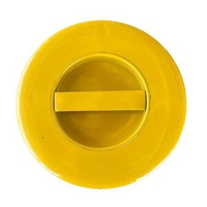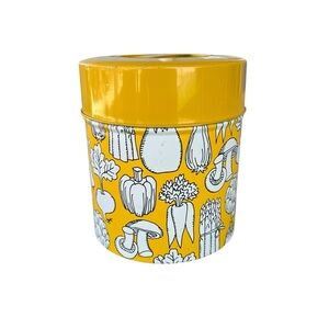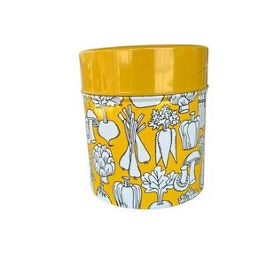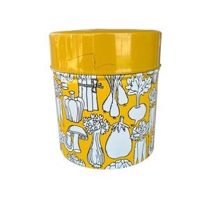 Vintage OMC Japan Vegetable Tin Canister. Yellow and White with all-over veggies, including Mushrooms, Asparagus, Radishes, Carrots and more!