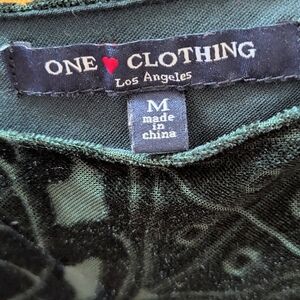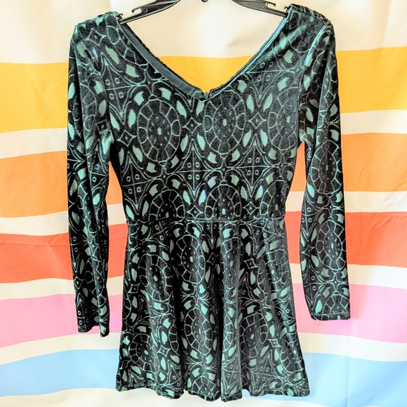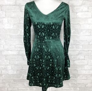 Stunning vintage One Clothing deep dark emerald green crushed velvet dress with a beautiful celtic like medallion burnout pattern. Flattering waistline and fit and flare / skater silhouette style. Zip up back. Absolutely perfect for fall into winter and the holidays! Would be so cute with knee high boots and a choker. A must have dress for every occasion.