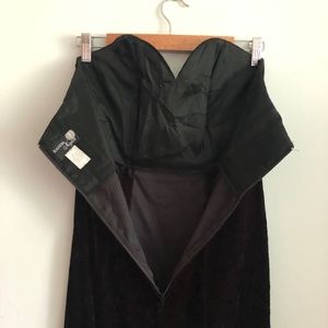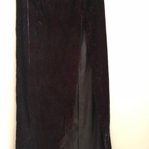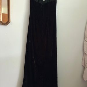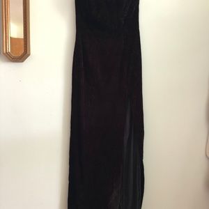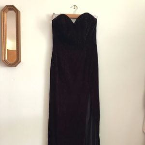 Vintage black velvet full length dress. Thigh high front slit, strap less, with sweetheart tip. Super sexy. The dress is a size 3 but I'm a 4 top and 8-10 below and it is only the slightest bit too small. I can barley get in but can move.