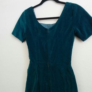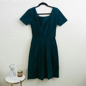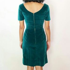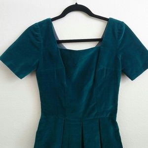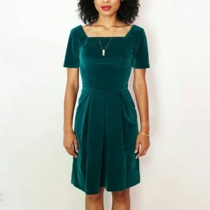 This fit to flare velvet dress is a rich emerald green color. It features a square boat neckline with a fitted bodice that has contouring and flattering stitching.
