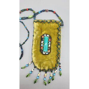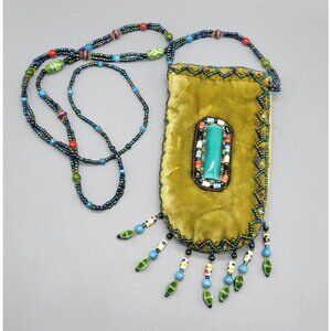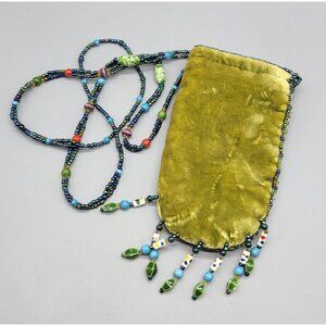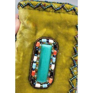 Vintage Velvet Olive Green Boho Beaded Handle Pouch Purse P1