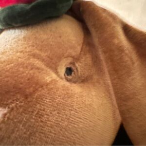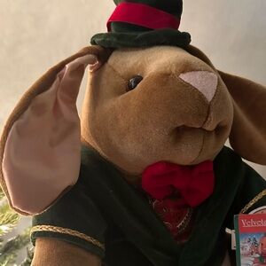 This Toys R Us vintage velvet plush rabbit is dressed in an elegant green vest, red bow tie and top hat, making it a charming addition to any collection. The intricate details reflect quality craftsmanship, while the soft material offers a delightful tactile experience. A lovely gift or decorative piece for enthusiasts of classic toys.