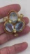 Fabulous hard to find Vendome brooch which also doubles as a scarf clip! The brooch features three very large open back glass stones in a light aqua blue accented with light peridot rhinestones. The brooch is framed with twisted gold tone metal. There is both a pin back and a scarf clip. Signed Vendome twice. 2 by 1 1/2”